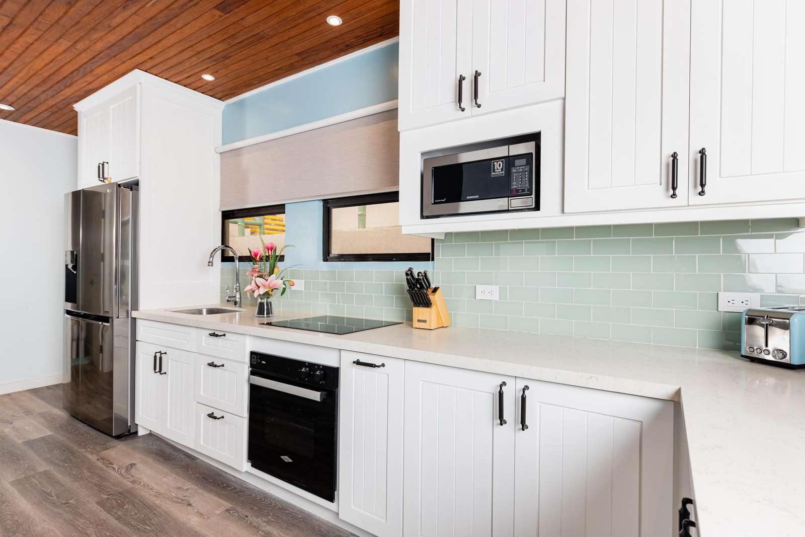 The fully equipped kitchen boasts granite countertops, wood cabinetry, stainless steel appliances, a built-in cooktop, and a cozy dining area. Everything you need for a seamless vacation is here — from cooking oil and spices to toiletries, beach towels, chairs, and a cooler for your seaside adventures.