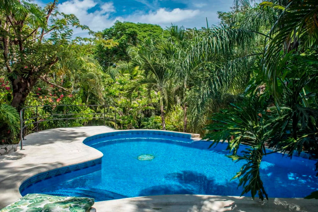 The villa has a private pool and parking around a beautiful tropical garden, and the entire property is gated. This house is up to 4 people.